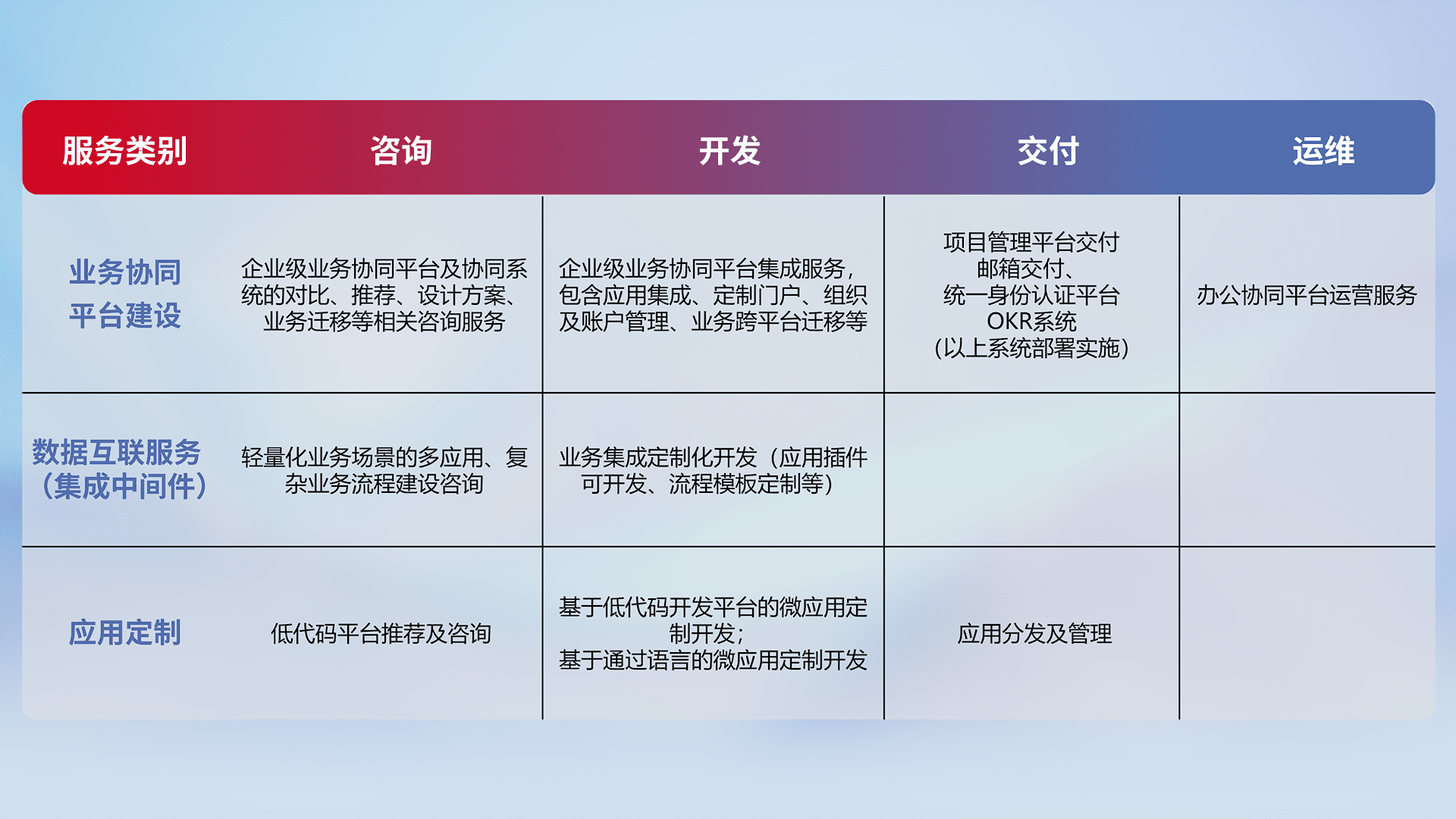 针对钉钉、、企微、、、、IDaas等平台级产品提供产品的规划、、、、方案、、、、交付、、、定制化开发等服务,,实现如统一协同办公、、智能客户服务、、、、混合会议管理、、、、智能数据查询、、、、等业务场景,,实现数字化转型。。。。